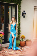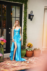 Get ready to slay in the Ava Presley Satin Center Keyhole Prom Dress 47032! This gown is pure fire, featuring a V-neckline and a center keyhole thats totally eye-catching. The crossed straps and lace-up low open back bring all the sassy vibes! Made from luxe satin, it feels amazing, while the pleating and chic slit let you show off your legs in style. The slim fit silhouette and spaghetti straps are a vibe, and the sweep train adds just the right amount of drama. Perfect for prom, this long dress is all about having fun, making memories, and feeling like an absolute queen!