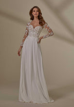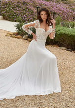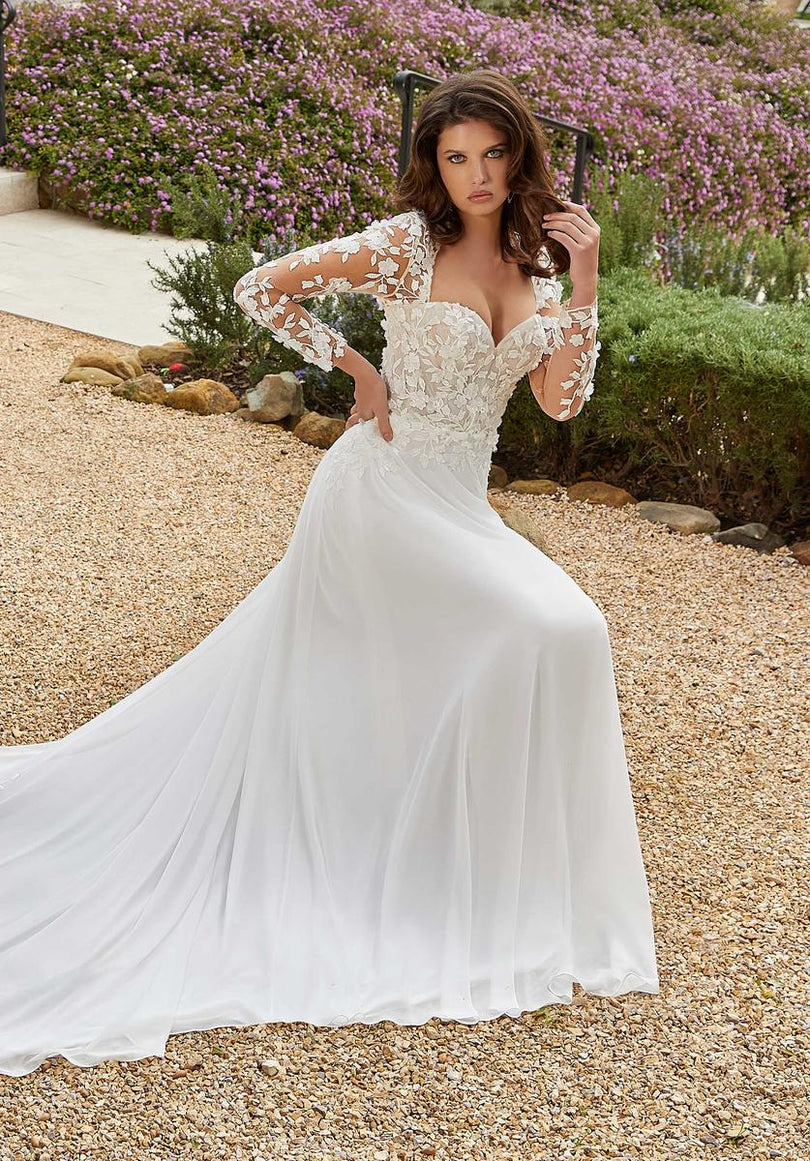 Morgan is the name of this wedding gown and is designed by Morilee Blu from Fall 2023 Collection, also known as style 4127. The Aline silhouette showcases a fitted bodice with sweetheart neckline and long sleeves. Adorned with breathtaking three-dimensional floral embroidery on the top and a chiffon skirt that glides off the body with romantic lace trimmed train that will sway with effortlessly with every step that you take! This wedding gown is the perfect one for any garden to beach ceremony. Need additional details on this gem, give us a call at Terry Costa or visit us in store to try this beauty on!
