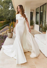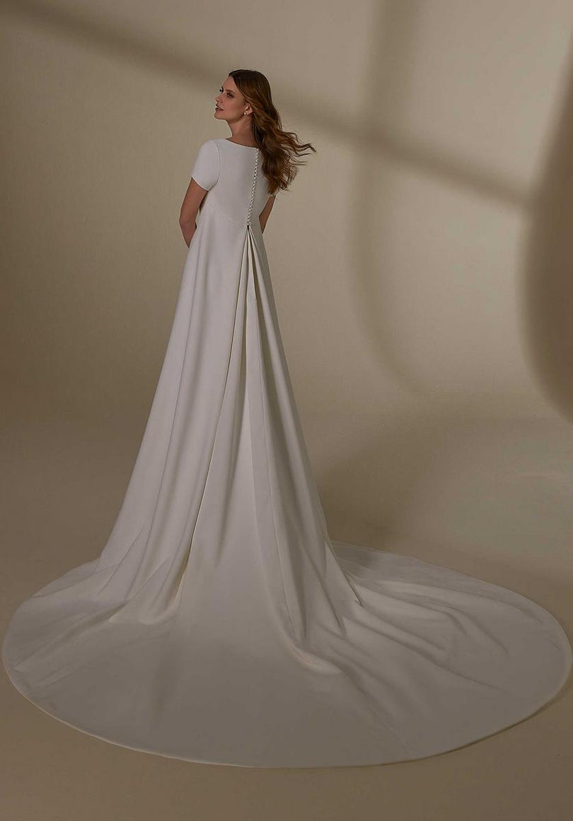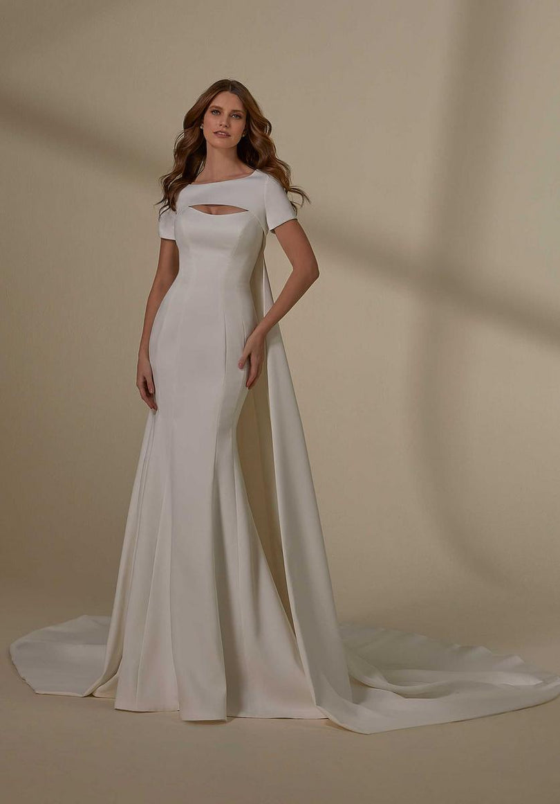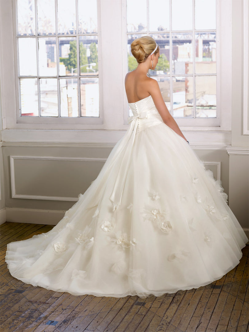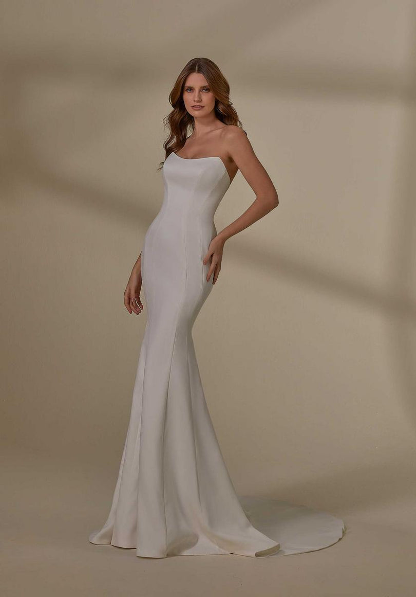The name of this Morilee Blu Gown is MarinOur Marin designer wedding dress is both simple and sexy, featuring contoured seaming that enhances your curves on the sultry fit and flare silhouette. The petal satin fabric gives the gown a soft glow and we love the modern touch of the strapless, scoop neckline contrasted by the classic covered buttons down to the hemline. For a more modest, traditional look, pair the dress with our Petal Satin Button Back Jacket. Shown in Ivory. Jacket does not ship with dress. Sold separately as Style 11452.