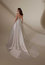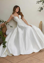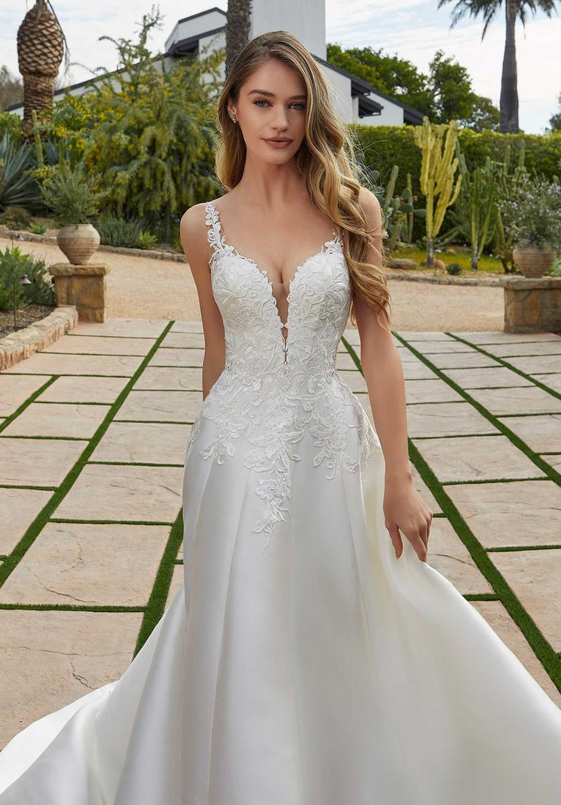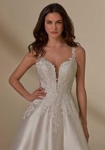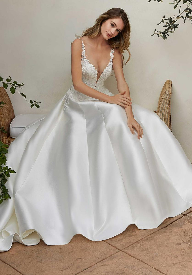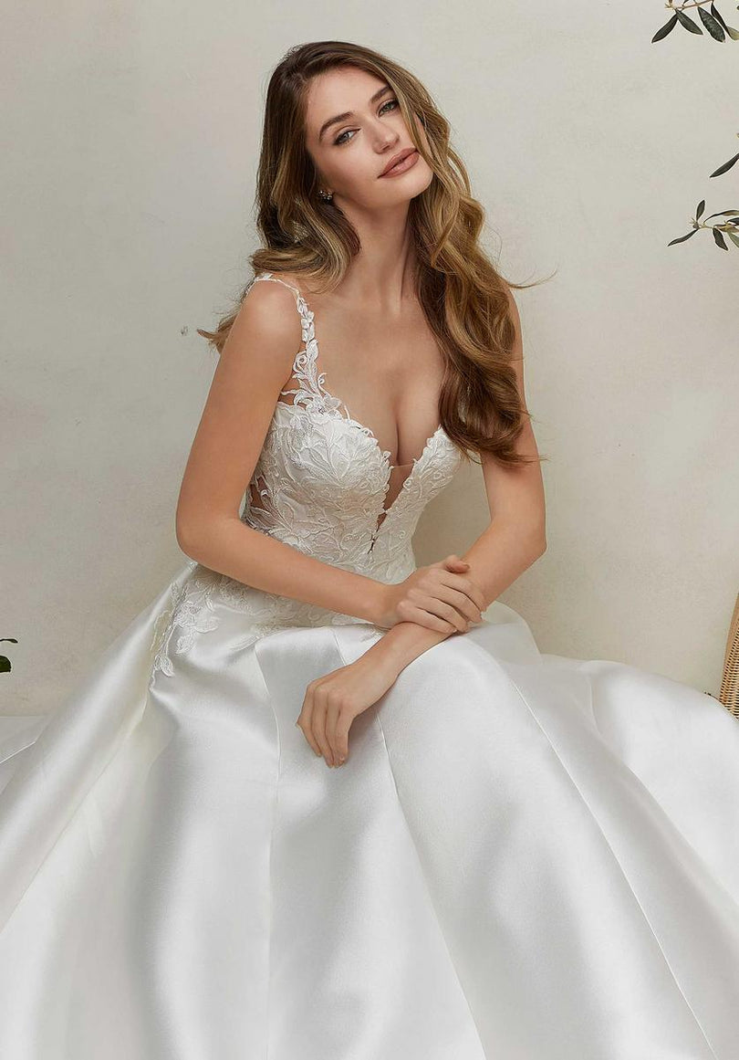 The name of this classic gown is Moira, 4133, from Radiance Collection and will have you feeling extremely confident and feminine. Created in silky satin and frosted lace, this gown is so stylish. A plunged sweetheart neckline on fitted bodice garnished in delicate lace, leading to a scoop back with sheer detailing. The luminous ballgown skirt falls beautifully as you take every step down the aisle. Don't wait any longer and take this beauty home! Perfect for any destination wedding and much more. For additional details on this gorgeous bridal gown, give us a call or visit us in store at Terry Costa.