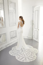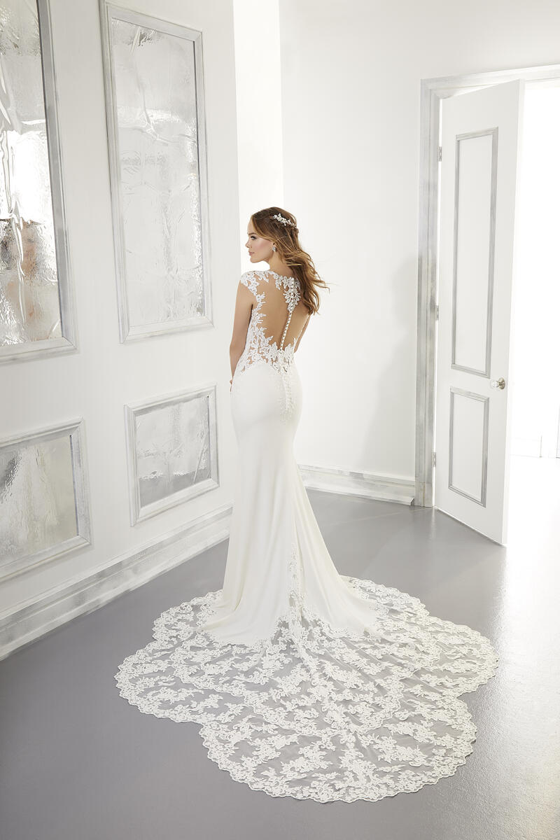 Demurely sexy and oh-so-chic, this is Aisha, style 5868, from Morilee's Fall 2020 Blu Bridal Gown collection. Designed with your destination wedding in mind, this affordable bridal gown is ideal for your beach setting or romantic, whimsical outdoor ceremony. Featuring vintage-inspired lace appliques on the waistline, delicate cap sleeves and deep-V plunging bodice, we're also especially loving the detailed illusion back. You're sure to turn heads in this crepe, fitted silhouette that they'll remember long after the honeymoon ends! A beautifully detailed cut-away petal train completes the look. Shown in Ivory/Honey. Please call our Dallas, Texas location to check in-store availability, pricing and current ship dates.