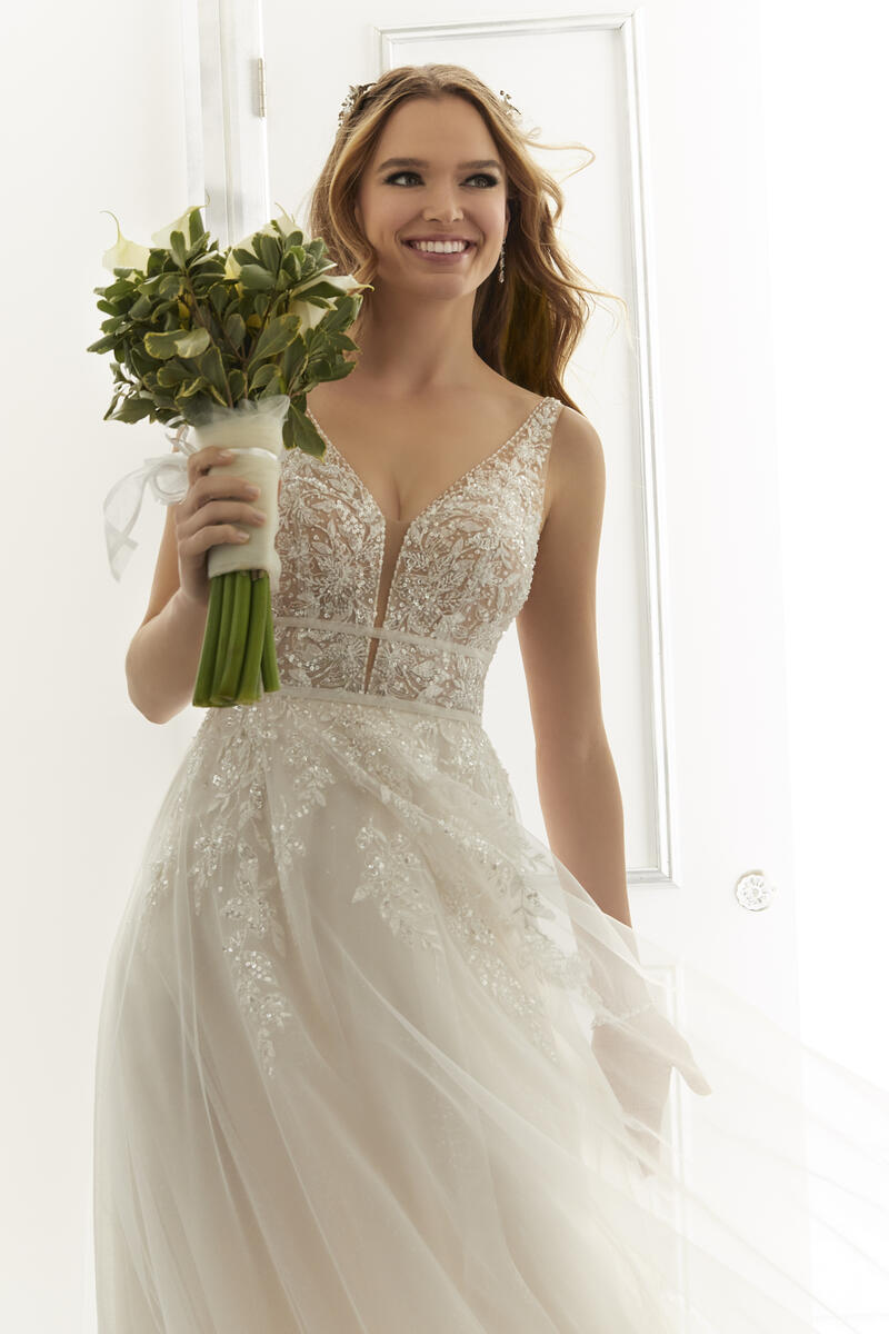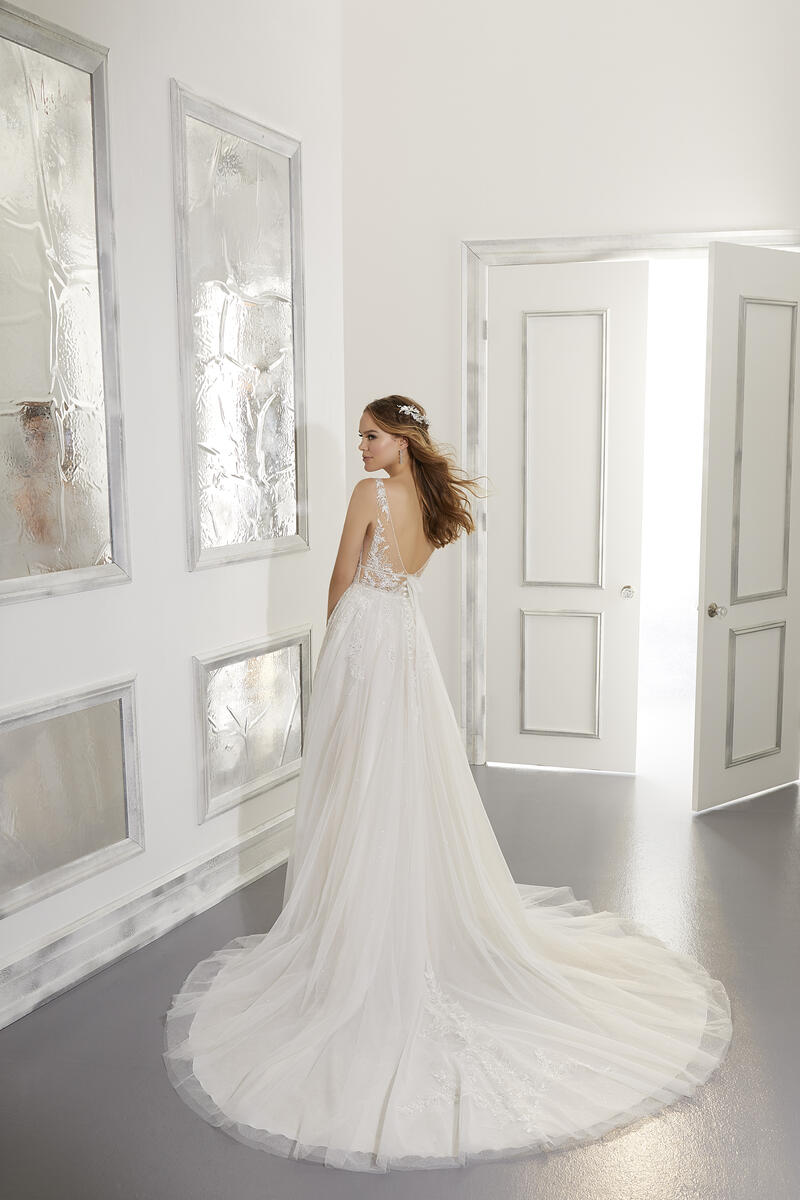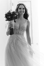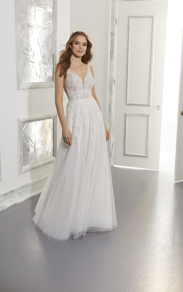 Pearl and crystal beaded embroidery add dreamy sparkle and dimension to the V-neck bodice of Angela, style 5879 from Morilee's Fall 2020 Blu Bridal Gown collection. A destination wedding dream dress, this look features delicate embroidery accents on a soft tulle a-line skirt and sheer train. A trendy and flattering double banded waistline accents the center--a perfect centerpiece to a chic yet affordable look your guests won't soon forget! This gown can be worn with or without the detachable sequined tulle underskirt, making it perfect for either your whimsical outdoor wedding or romantic beach setting. Flattering on any body type from pear-shape to hourglass, this look is also available in sizes 16W-32W as Style 5879W for our fabulous plus sized brides ready to show off their curves! Shown in Ivory/Prosecco/Honey. Please call our Dallas, Texas location to check in-store availability, pricing and current ship dates.