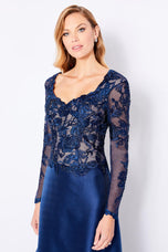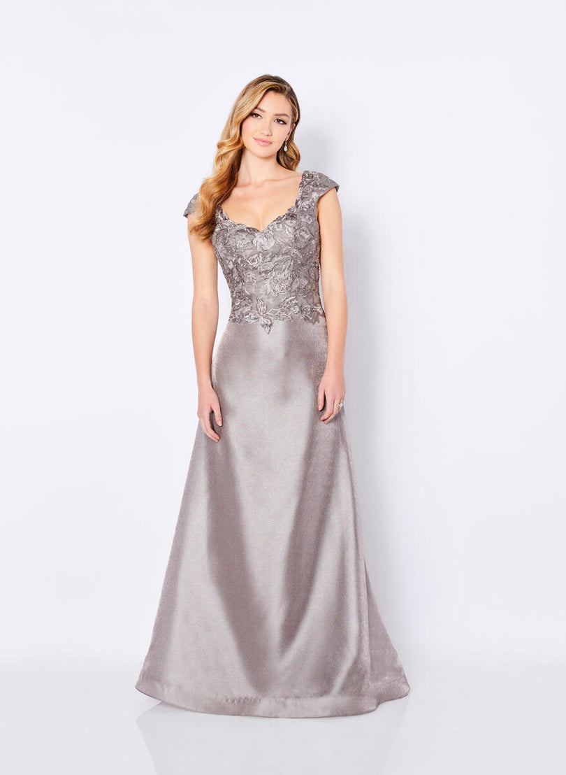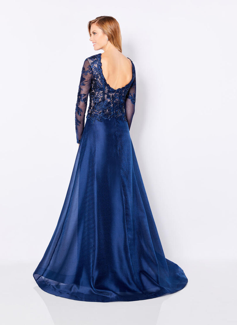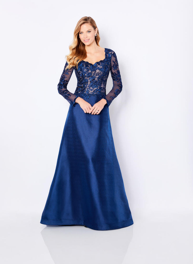 Leave them in awe when you come in wearing Cameron Blake style 221683. This gown has a fully lace bodice with shimmering embellishments. Off the rack this gown has delicate capped sleeves, but with some help from your tailor you can add the removable long sleeves. The beautiful floor length organza skirt will have you looking and feeling regal. If you are looking for a mother of the occasion gown or a guest of the occasion dress then shop here at Terry Costa.
