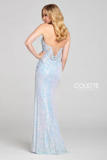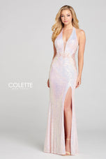 Sleeveless stretch sequin and lace applique with stone accents sheath gown, with a plunging V-neck, natural waist, lace up back, front slit, and sweep train.