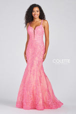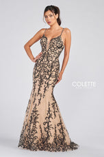 The fabric in this Colette by Daphne style is Glitter tulle and lace mermaid gown, plunging neckline, beaded lace, horsehair hemline and open, lace-up back.