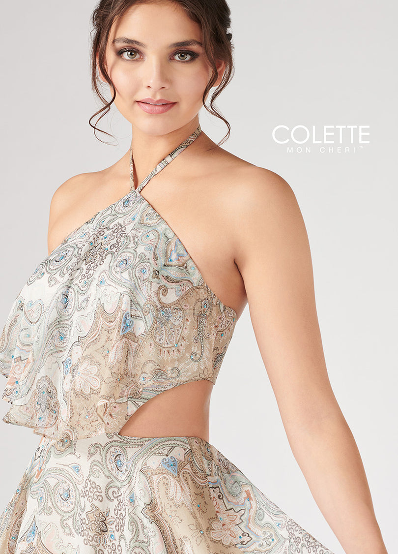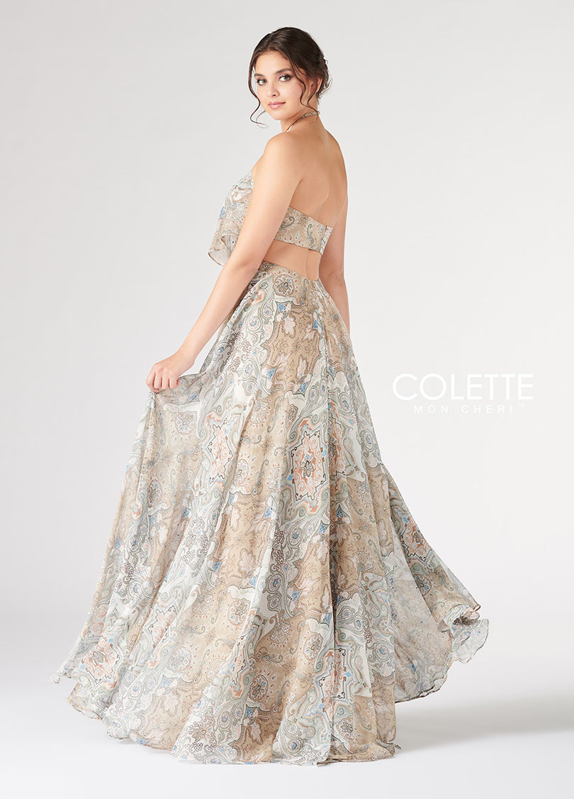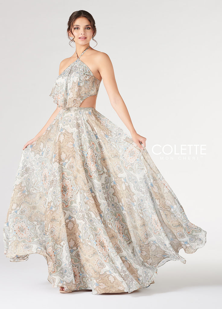 Unique sleeveless printed chiffon gown featuring inverted halter,ruffled top, cut out back and sides, natural waistline, flowy skirt