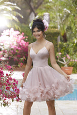 Selfie time! 9551, is a sweet short Aline gown designed by Morilee Damas, showcasing a flattering v neckline with thin straps that crisscross and corset back. A thick band that will accentuate your waistline and full layered tulle skirt adorned with lovely three-dimensional floral details.