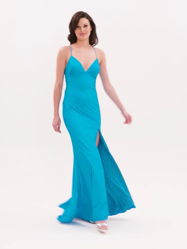 Take those instagram worthy photos in Faviana Prom! Style S10826 is a sleek fitted gown with tonss of fresh style. This stretch charmeuse gown has a v-neckline and skinny straps that go into the sexy open back and its crisscross lace-up straps. Flattering ruching on the back near the zipper will accentuate your curves. Perfect for your next Gala or Special Occasion Affair.