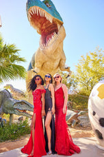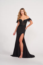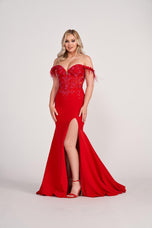 Look simply stunning in this long prom dress from the Ellie Wilde prom dress collection! Ellie Wilde EW34028 is classy and sassy! The fitted off the shoulder bodice is accented with feathers! The corset bodice features a sequin lace illusion detail that is mesmerizing! Perfectly placed 3D Floral appliques had dimension to this long dress! Completed with a fitted skirt with high slit and slight train! Slay prom, homecoming, an evening event and more in this long off the shoulder prom dress!