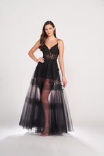 Looking for a truly unique prom dress? Ellie Wilde long prom dress WE34032 features many unique details for a perfect prom night! The v-neck fitted bodice features an illusion corset with lace applique detail. A lace-up back and glitter tulle illusion skirt add some drama to this Ellie Wilde prom dress. You will love the dramatic illusion skirt with exaggerated horizontal detail! Go classic in black or bold in hot pink!