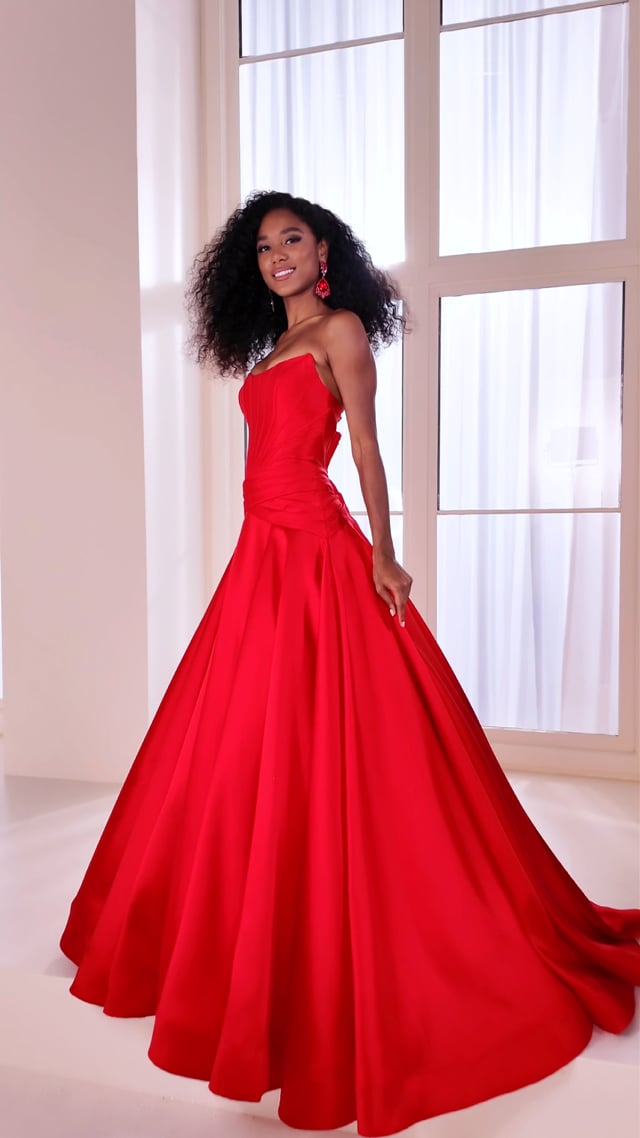 Create your modern fairytale moment in this stunning A-line dress by Mon Cheri. To start, the strapless design features a striking cat eye neckline, beautifully framing your shoulders and collarbone. This allows you to feel free spirited while you dance your night away. Next, a pleated corset bodice not only offers impeccable structure but also enhances your natural shape, while the criss-crossed asymmetrical waistline adds a contemporary twist to the classic gown style. The open back creates a dramatic exit, ensuring every angle of this gown leaves a lasting impression. Perfect for making an unforgettable entrance, this dress combines sophistication and romance, evoking a true modern fairytale feeling. Style EW36105 is your 2025 prom dress!