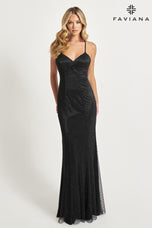 Hit the dance floor in style with this mesmerizing Faviana gown, 11080, from Spring 2024 Collection. This stunning gown showcases a plunged neckline with dainty straps and eye-catching cowl back. The straight fitting gown is garnished with shiny rhinestones that will shimmer from every angle! Be the star on Prom night.