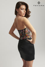 Show off your fun side and blooming personality with the Faviana 11127, a stunning short floral homecoming dress that's perfect for dancing the night away! This strapless design features a beautiful floral illusion bodice made from stretch satin, creating a light and airy feel while still offering a touch of coverage. The bodice is cinched with a corset back, ensuring a perfect fit and a touch of drama.A playful shark-bite slit adds a touch of leggy allure to the short skirt, making this dress ideal for homecoming festivities or any cocktail event where you want to stand out. The combination of the floral pattern and the flirty silhouette makes the Faviana 11127 a truly unique homecoming dress that's sure to turn heads. It's both playful and elegant, making it a perfect choice for creating unforgettable memories on your special night.