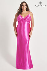 Be in Barbies World with this vibrant color knows as Lipstick. 9549, is a Faviana masterpiece from Spring 2024 that displays a sexy v-neckline with ruched top. The metallic fabric will hug on your curves perfectly and is completed with a stunning sweep train with horsehair hem for extra volume! Don't miss out on this beauty for Prom and much more!