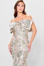 Have your own red carpet moment in this glamorous trumpet gown. Crafted from shimmering metallic brocade, this exquisite mother-of-the-bride style is simply breathtaking. The elegant sweetheart neckline gracefully highlights the decolletage, while the statement bow adds a touch of romance. A matching shawl completes this celestial style.