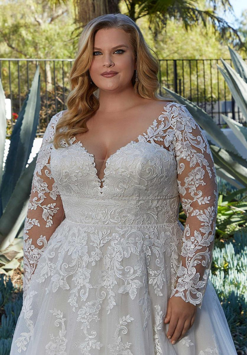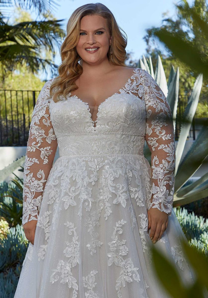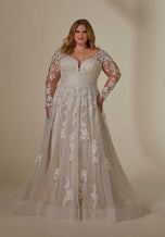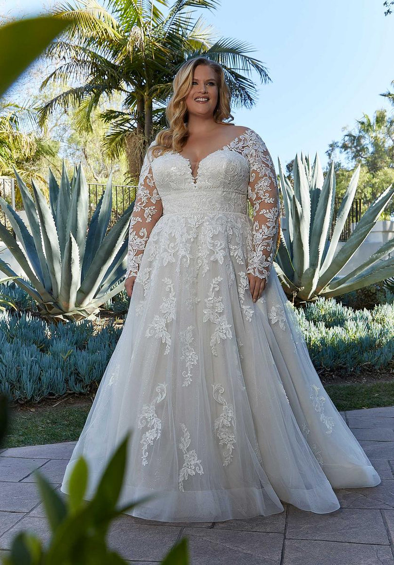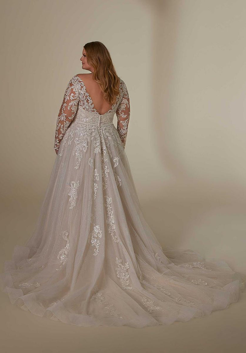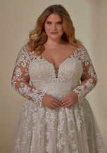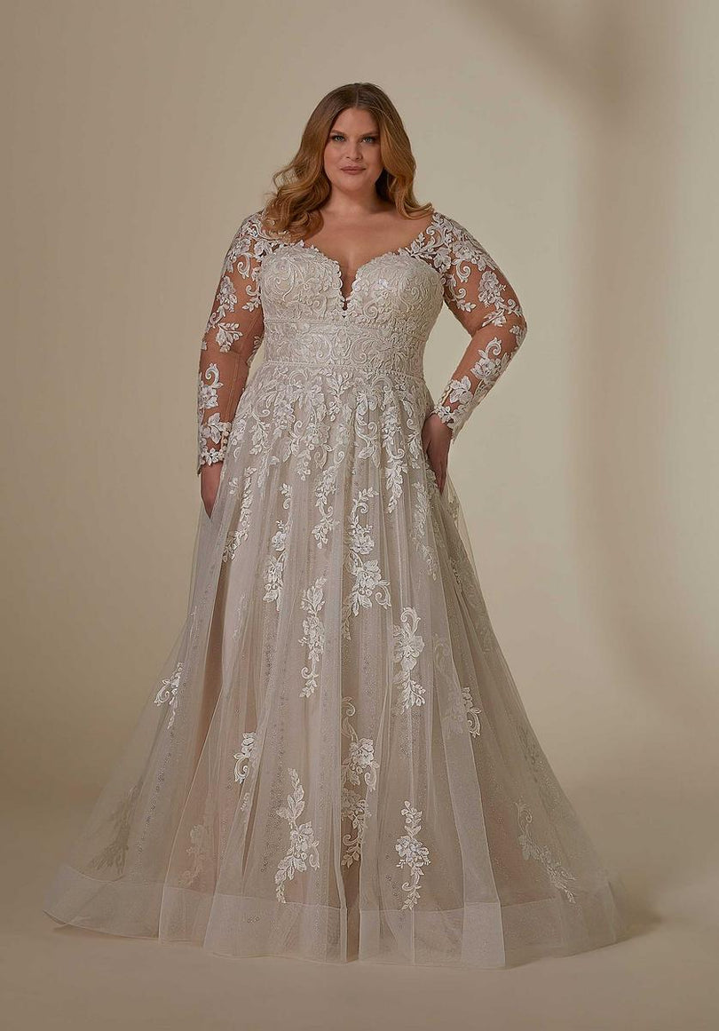 Our Lenora designer wedding dress gets the royal treatment with stunning frosted, embroidered lace on a sparkle tulle gown. The double banded waist cinches in your figure and enhances the flare of the A-line skirt. A wide v-neckline is supported by sheer straps and if you love the look of long sleeves, style the dress with our detachable illusion sleeves. Shown in Ivory/Champagne/Honey. Sleeves also sold separately as Style 11458.