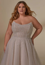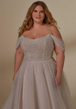 Our Luna designer wedding dress offers a celestial sparkle. The flowing ball gown has a structured, boned bodice encrusted with glimmering pearl and crystal beading that delicately floats down the A-line tulle skirt. Detachable draped off-the-shoulder sleeves also features beautiful beading enhancing the ethereal look of the dress. Shown in Ivory/Champagne/Honey. Sleeves also sold separately as Style 11461.
