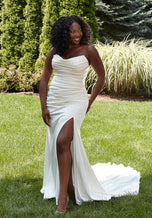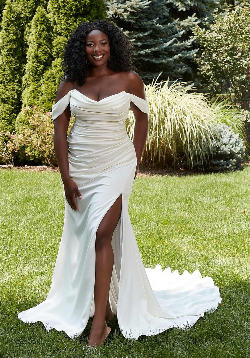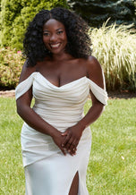 Our Nicky designer wedding dress is all about sultry sophistication. The stretch satin fit and flare has chic draping for an ultra-flattering look and incredible texture. The scoop neckline accentuates your curves, leading to a sheer back detail that exposes the couture boning. The front skirt slit allows for a sexy pop of leg, while detachable off-the-shoulder sleeves give you versatility in styling. Shown in Ivory/Honey.