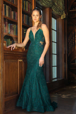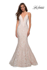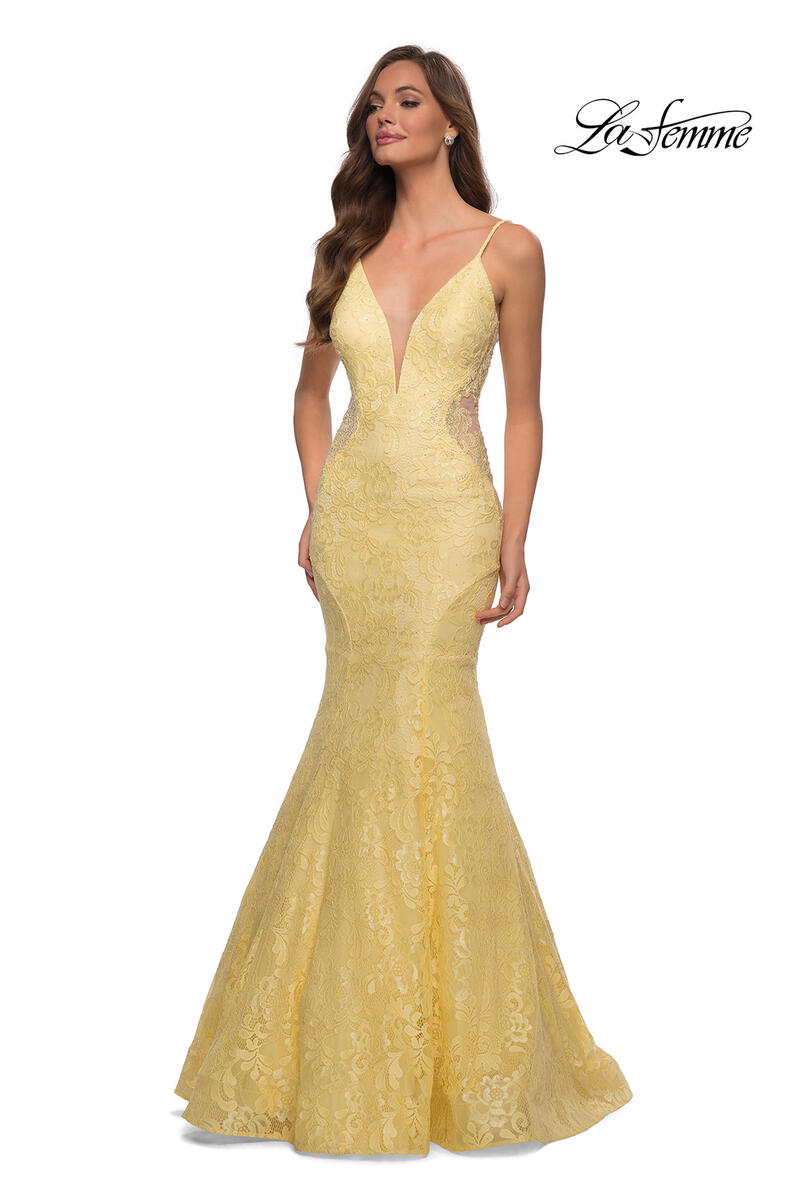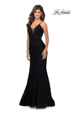Be Red Carpet ready in this mermaid gown designed by La Femme. Style 28355 features a plunging v-neckline with a sheer mesh insert and thin shoulder straps.The slim fitting silhouette is fully covered in a delicate lace material and showcases sheer midriff panels that will accentuate your curves. Great gown for a Black-tie, Gala or Prom!