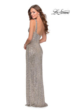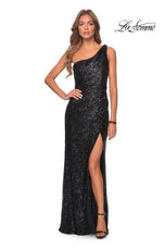 Feel and look like a million bucks in this glamorous gown by La femme. 28401 features a one shoulder neckline that leads into a slim fitting sihlouette, that will show off those curves! A finshing touch of a side thigh-high slit. This fully sequin gown is perfect for that night out, Prom, or Gala!