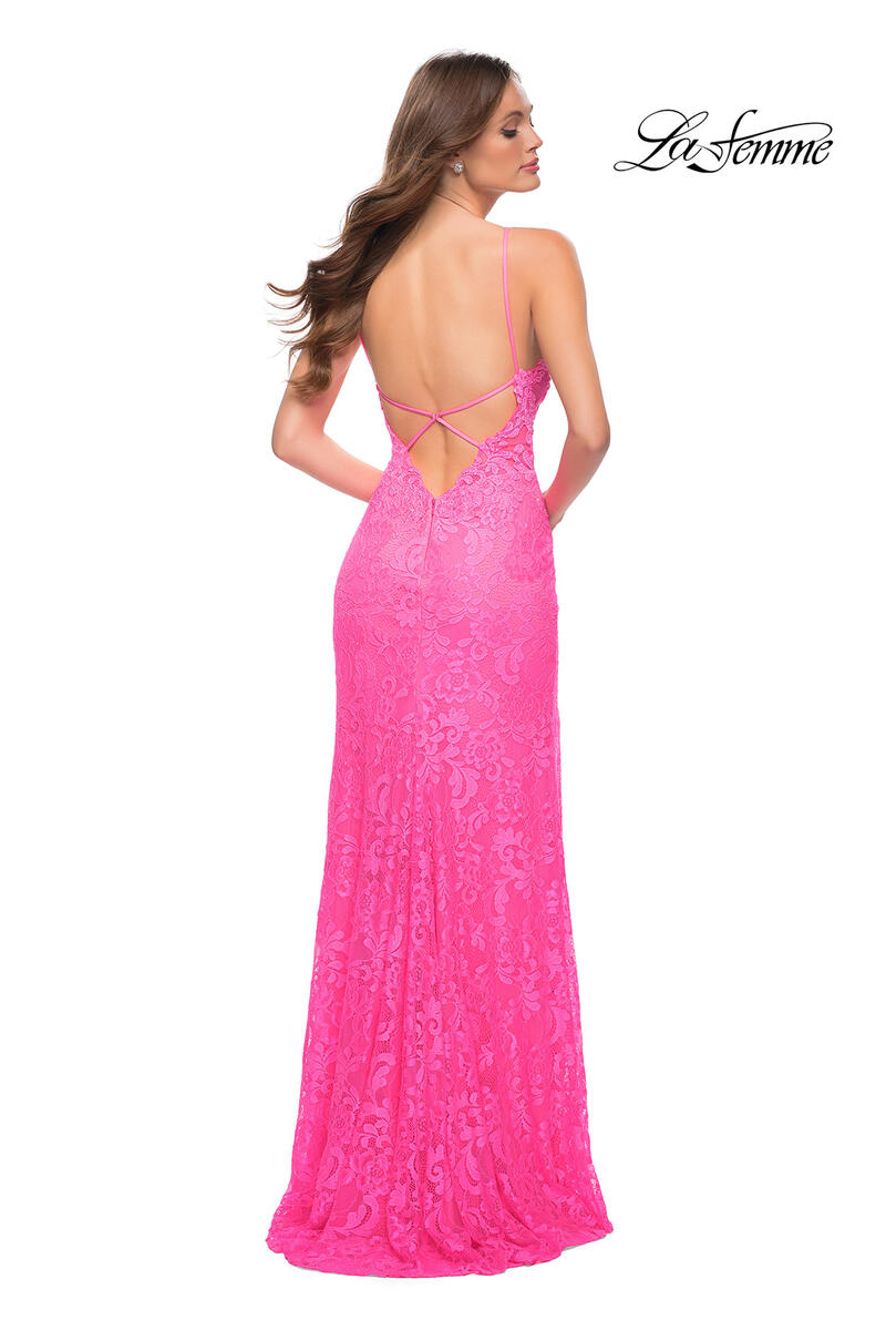 Pretty in pink! This fitted formal gown, 29987, is made in a vibrant lace fabric. A deep v-neckline with mesh insert, thin straps, statement open crisscross back. The fitted gown will hug your figure beautifully and is completed with a front leg slit and sweep train that will sway with every step that you take! Perfect for Senior Prom, Sorority Formal or Black-tie.