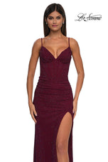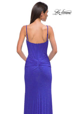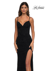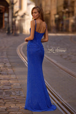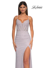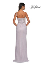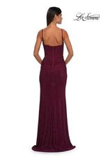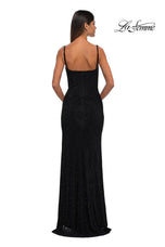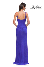 The fabric in this La Femme Prom style is Hot Stone Net Jersey