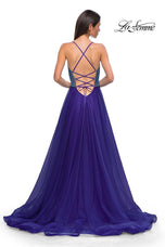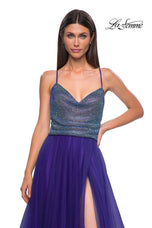 The fabric in this La Femme Prom style is Hot Stones and Tulle