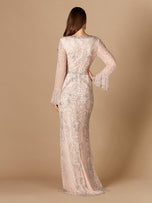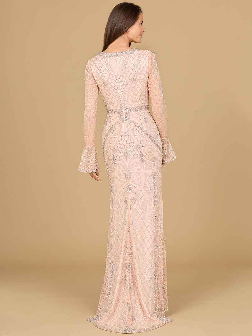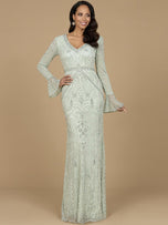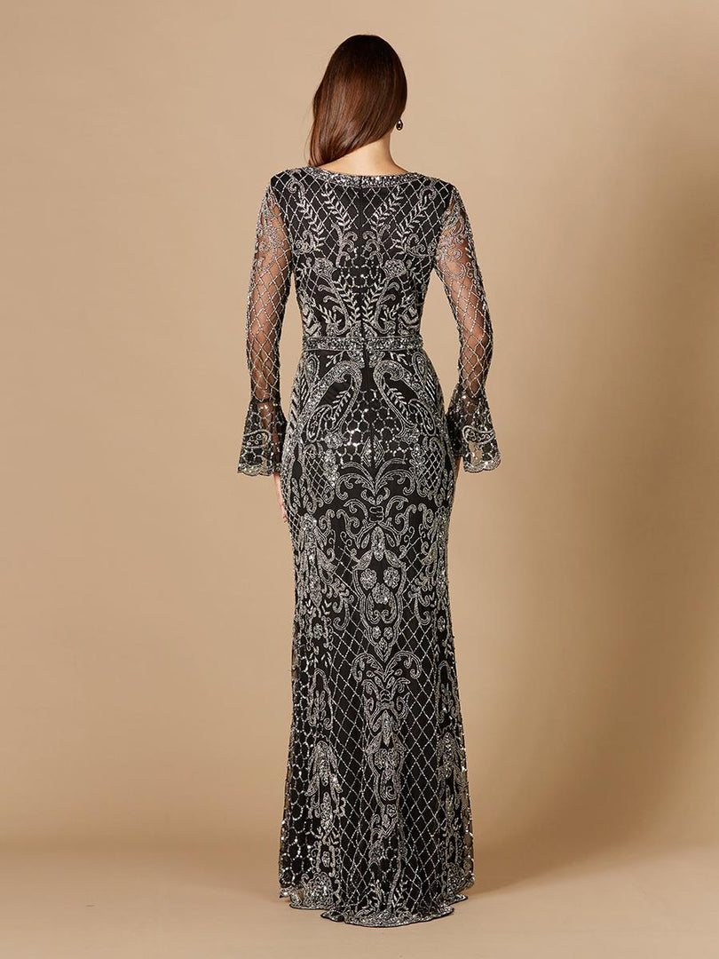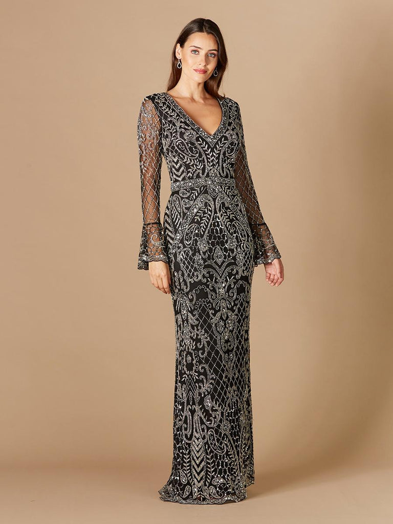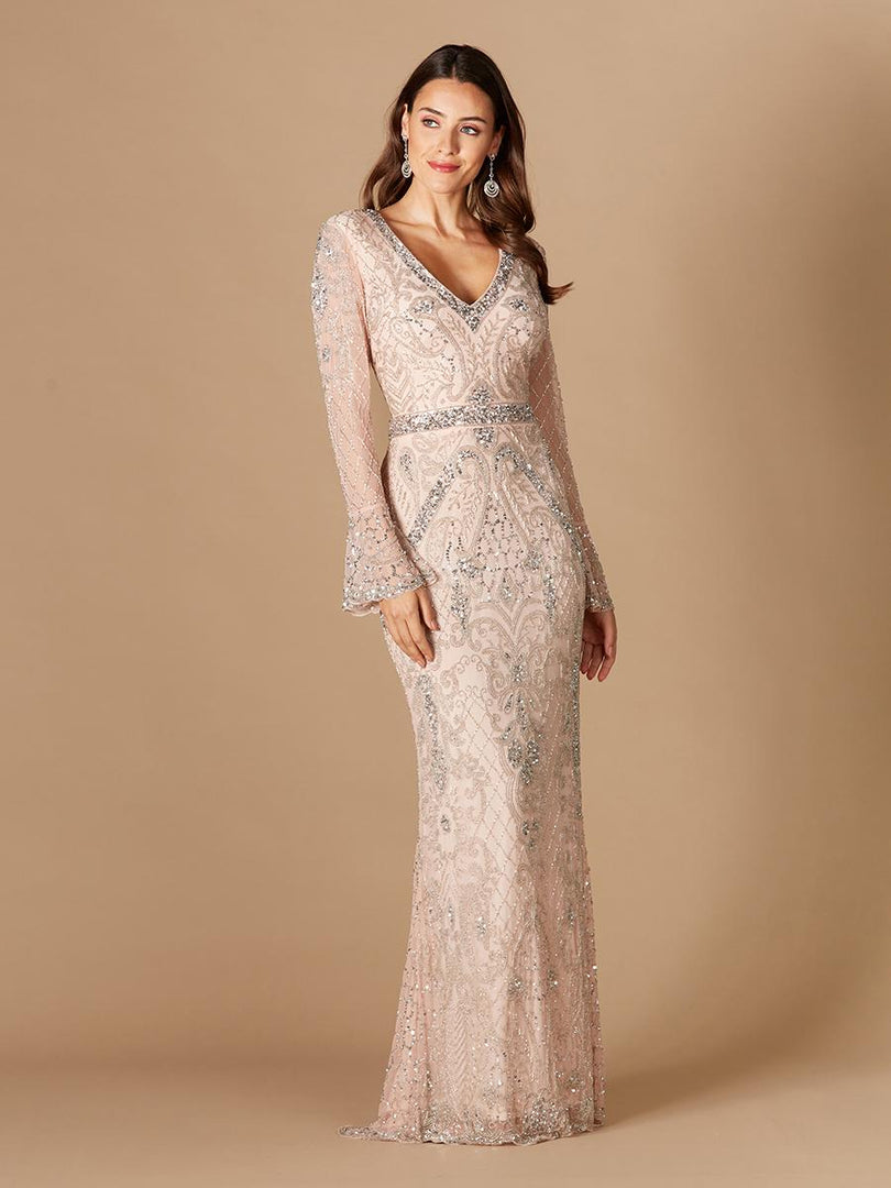 Lara Long Bell Sleeve V-Neck Beaded Evening Gown 29358