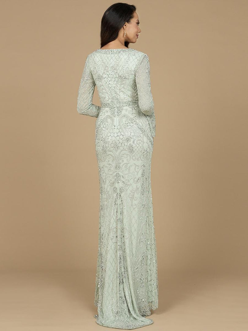 This long sleeve gown features a v-neckline and geometric beading patterns. The stretchy material makes fitting easy for any size. Wear this to your daughter's wedding, and stand out from the crowd. This dress is a final sale. No Returns or Exchanges.