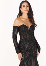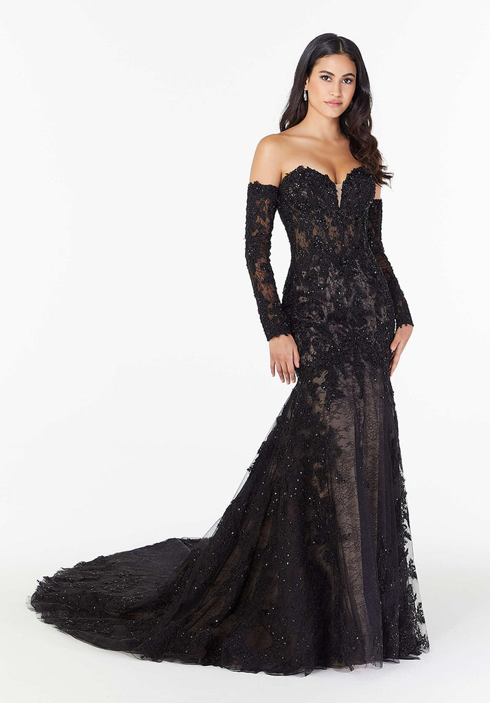 Our Georgina designer wedding dress is onyx opulence. The glamorous fit and flare has a sheer, boned bodice with an exaggerated sweetheart neckline on a Chantilly lace and shimmering sparkle tulle gown accented by beautiful beaded Alencon lace appliques. The sheer, lace trimmed train is breathtaking and detachable gauntlet sleeves add extra drama. Shown in Black/Nude.