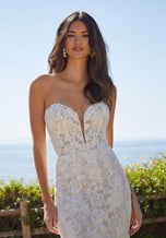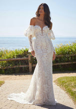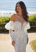 Our Luciana designer wedding dress is all about decadent design. The stunning fit and flare features exquisite crystal beaded Alenon lace appliqus over romantic Chantilly lace. The boned, sweetheart bodice has a sculptural effect with a sheer plunge, and we love the subtle illusion detail in the back. For a whimsical effect, wear the dress with the matching detachable long pouf sleeves. Shown in Ivory/Cappuccino/Honey.