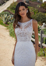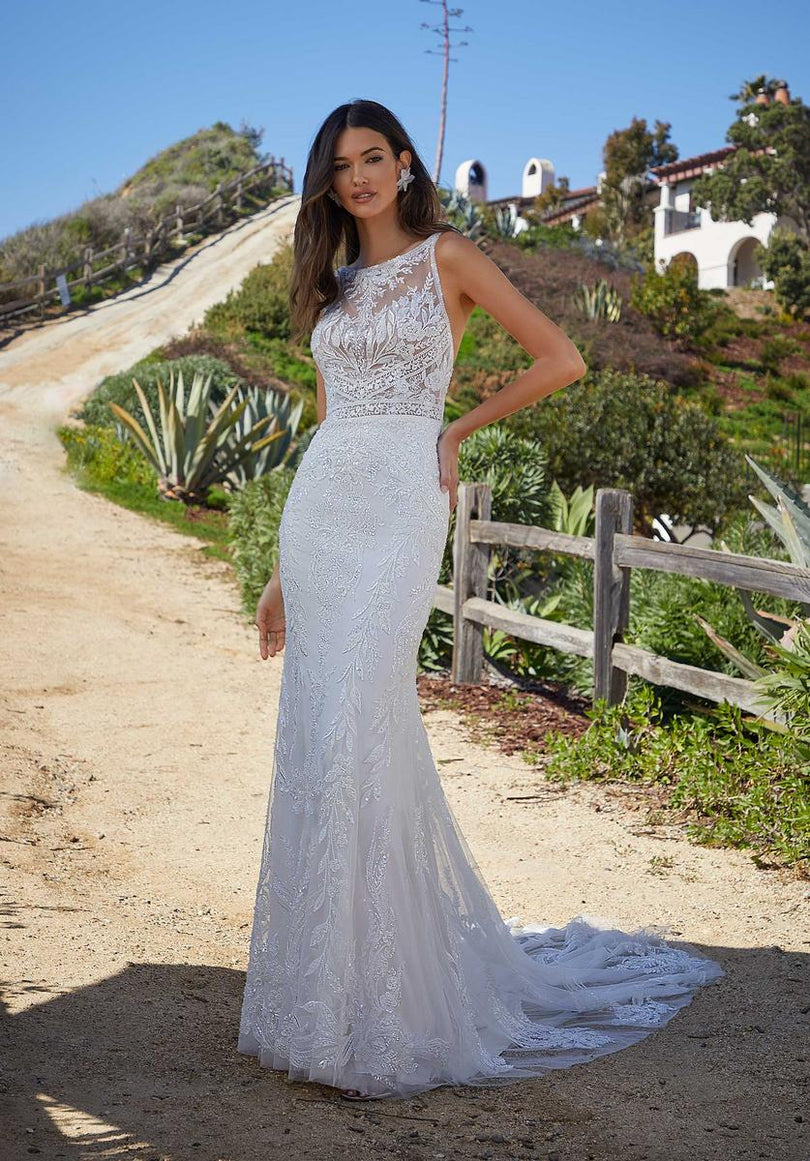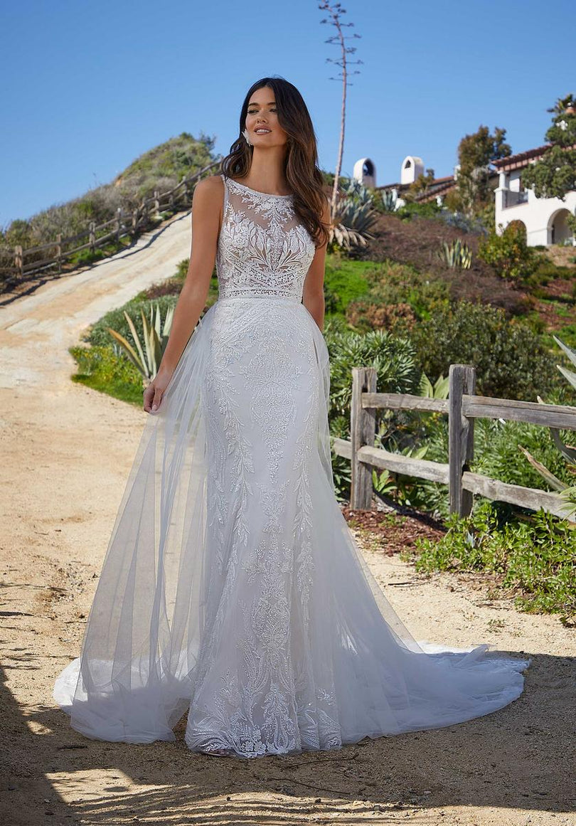 Our Leonita designer wedding dress is a glamorous gown with a boho flair. The shapely fit and flare features glittering pearl and crystal beaded lace that cascades down from the sheer jewel neckline. The bodice has geometric trim that creates the look of a narrow waist and meets up with a detachable tulle overskirt that creates an airy and ethereal effect. Shown in Ivory/Sand/Honey. Sleeves also sold separately as Style 11484.