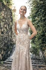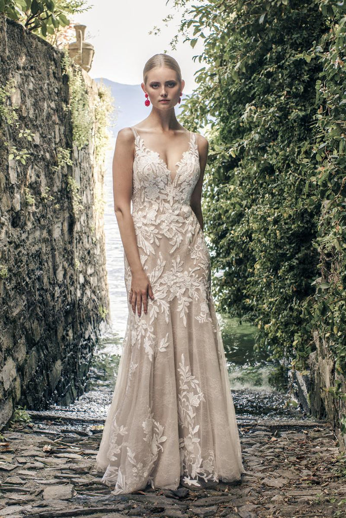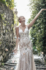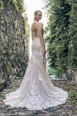 Celebrate the romance of the Madison James Spring 2024 Bridal Gown Collection with the "Hope" lace fit-and-flare gown. Adorned with delicate lace appliques over alenon lace, this gown is a vision of timeless elegance. The plunging neckline and low back add an alluring touch, creating a perfect blend of sophistication and romance. Designed for a romantic outdoor ceremony or a breathtaking beach affair, "Hope" is the epitome of grace and style. Let this gown be the canvas for your love story, as you embark on a journey of elegance and beauty on your special day.