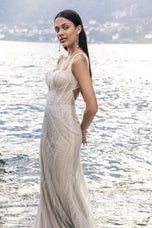 A stunning addition to the Spring 2024 Madison James Bridal Gown collection, this is Huntleigh, a gorgeous boho-chic gown that fits so many bridal aesthetics. Mimicking the movement of of ocean waves, her sequined and beaded appliques swirl and dance across this bridal sheath gown, which is finished with detachable sleeves (sold separately). Whether you're envisioning a beach wedding or romantic destination ceremony, she's just the right fit for your aisle style.