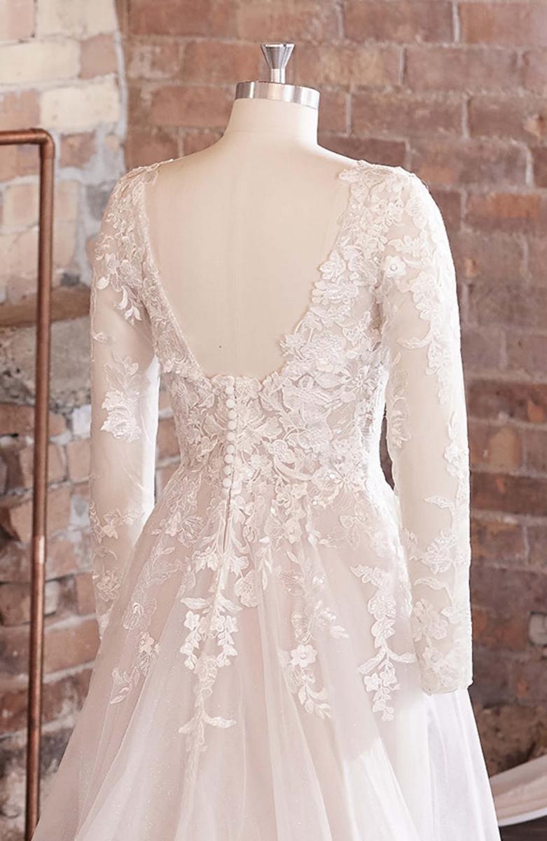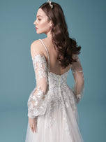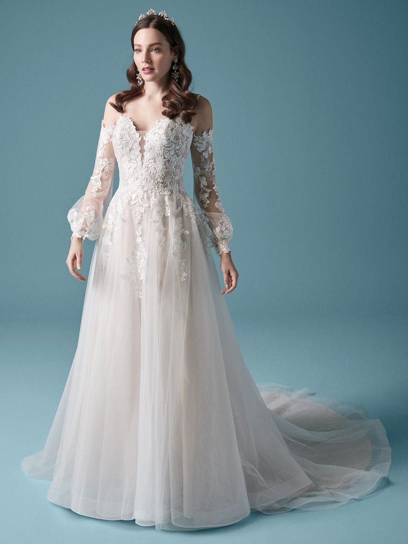 A cold-shoulder bishop sleeve princess wedding dress for A) looking like you stepped out of a Pre-Raphaelite painting, and B) happy-crying with your betrothed. ; Sheer organza lined beaded lace bodice; Sparkle tulle skirt; Sheer organza lined lace back; Plunging illusion V-neckline; Beaded spaghetti straps; Horsehair hem finish; Covered button over zipper closure; Extra lace motif included for minor neckline alterations; Detachable off-the-shoulder bishop sleeves sold separately;