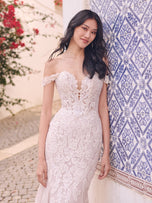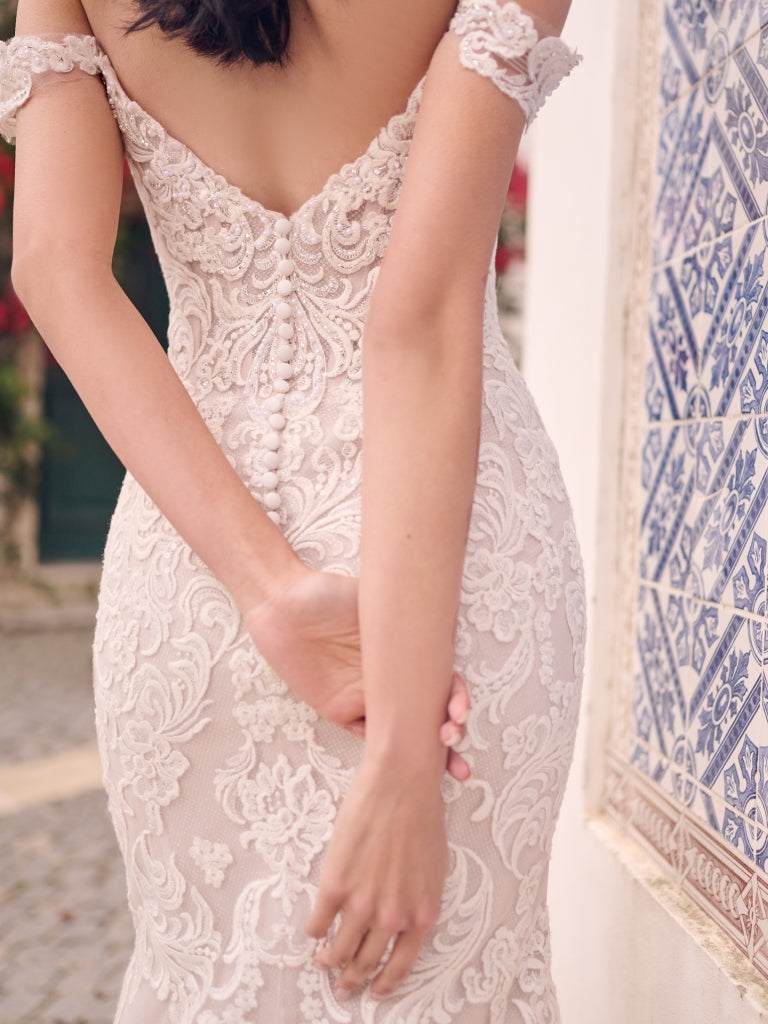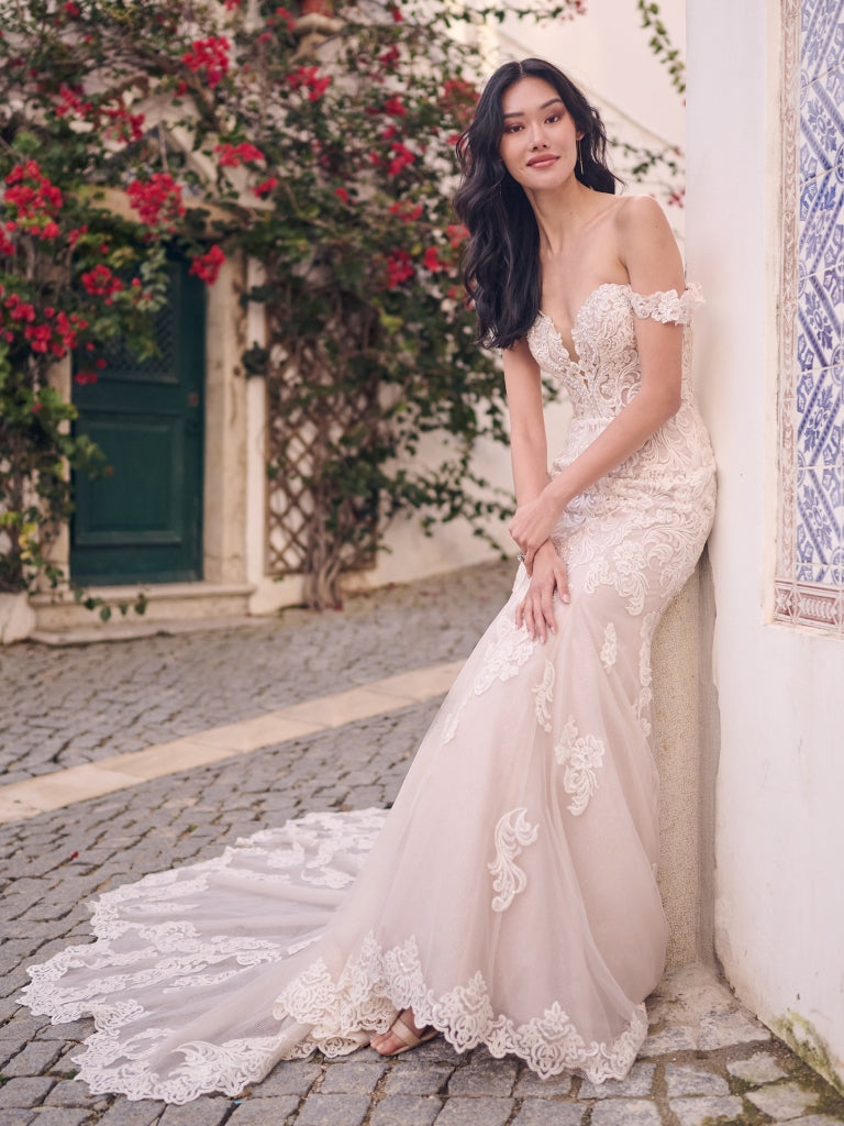 Vintage fit-and-flare wedding gown with lace off-the-shoulder cap sleeves. There may be photos of multiple versions of this style pictured. Please check with us for details and pricing on the different variations.