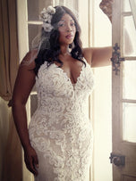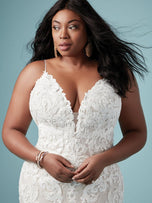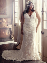 A beautiful, plus-sized version of the original Tuscany Gown, this sheath bridal gown is featured in Maggie Sottero's newest bridal collection! Designed with your curves in mind, we're loving the v-neckline and delicately beaded straps. Perfect for your destination wedding or formal church ceremony, this gown is finished with zipper closure and boho-inspired lace appliques throughout