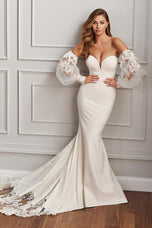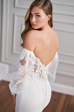 Aria is the perfect blend of modern glamor and whimsical romance. Sophisticated stretch crepe is accented with dreamy Schiffli lace applique to create this impossibly elegant fit and flare gown. The ultra-flattering sweetheart neckline and softly structured bodice accentuate the waistline, while the off-the-shoulder illusion bishop sleeve completes this showstopping look.