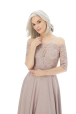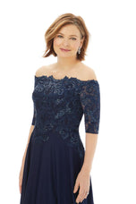 Perfect for Mother of attire! This MGNY Long Evening Dress, style 72220 is an A-line Off-the-Shoulder Classy Gown that is fully adorned with scalloped Lace Neckline. Lace Bodice with Elbow Length Sleeves. Great to wear as Mother of the Bride, Mother of the Groom, for a Gala, or for any Formal Event! Give us a call for instore availability on this gem! This dress is a final sale. No Returns or Exchanges.