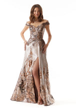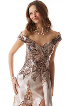 MGNY Mother of the Bride Dress (style 73008) is a captivating choice for the style-conscious mother of the bride. This glamorous evening gown stuns in a luxurious metallic jacquard fabric that shimmers with every move. The unique fabric features contrasting metallic threads, creating an elegant textured effect that adds depth and dimension to the design. The surplice bodice flatters your figure with its diagonal drape, while the off-the-shoulder neckline adds a touch of romance. A delicate cuff detail on the neckline adds a playful touch, showcasing expert craftsmanship.The full skirt of the MGNY Mother of the Bride Dress (style 73008) cascades down from the waist, featuring a front drape that adds a touch of drama and a side slit for a touch of modern sensuality. This thoughtful detail allows for ease of movement throughout the evening celebration. This versatile gown is a surefire way to turn heads and leave a lasting impression, making it perfect for any special occasion, whether you're attending a wedding or a formal event!