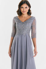 Be the talk of the party in this modern and elegant look by Montage. Style 116950 showcases a stunning wide v-neckline with a fitted bodice and sheer illusion three-quarter sleeves. The bodice is adorned with shimmering beads that create a slenderizing bead pattern. The A-line chiffon skirt is the perfect finishing touch. This Montage dress is the perfect attire for Mother of the occasion, Black-tie or Winter formal!