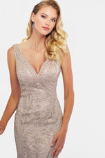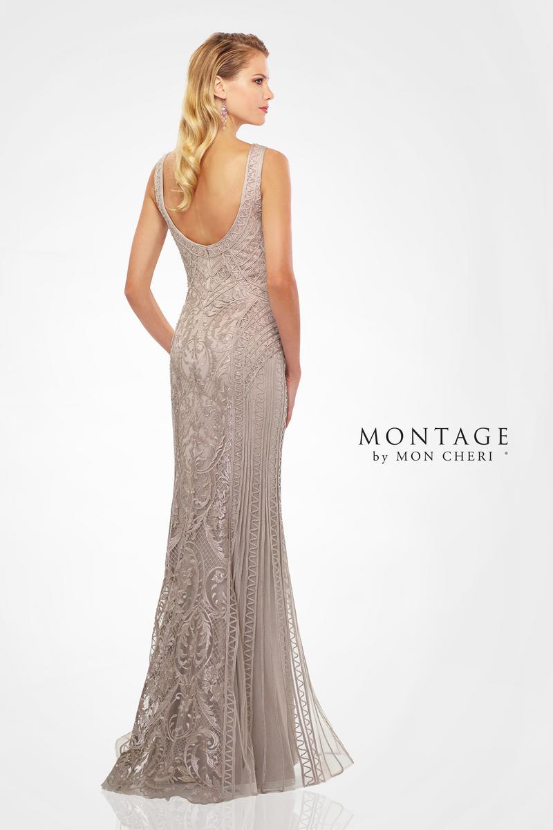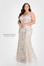 Montage style 118975 us elegant and refined. This gown has beautiful ribbon work lace details along with glimmering crystals. This gown also has a beautiful V shaped neckline and scoop back. If you are looking for a mother of the occasion gown or a formal gown then this style is for you!