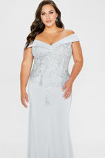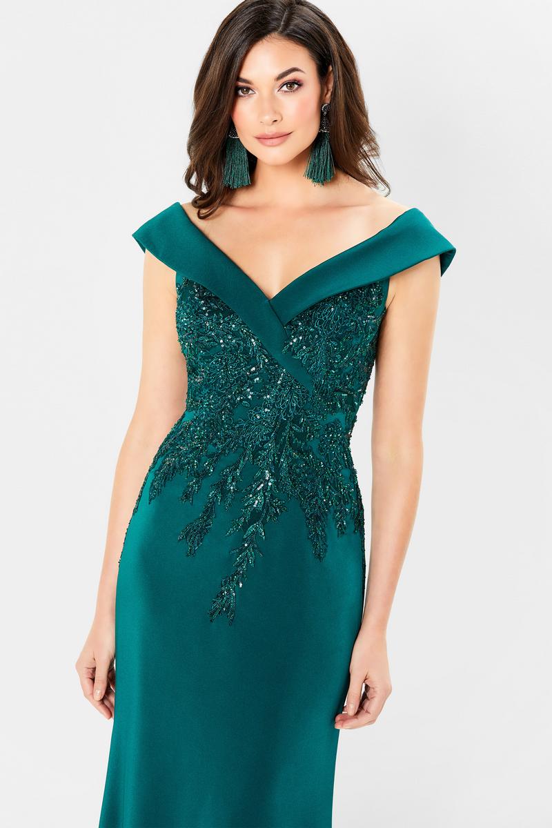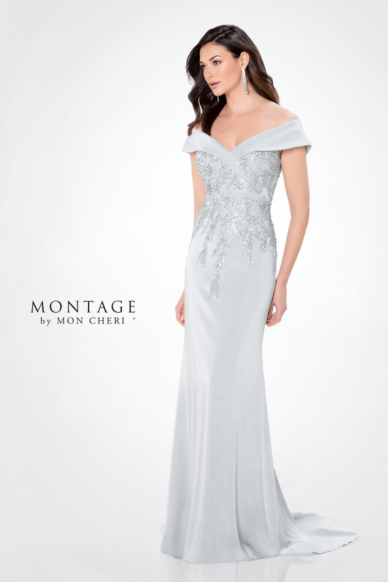 Be the talk of the night in this stunning long formal gown from Montage by Mon Cheri.220932, showcases an off-the shoulder portrait collar neckline. This figure flattering gown is fully adorned in beaded lace appliques that cascade to the waistline giving you a natural waist. Completing this look is a sweep train that will sway with every step that you take! perfect gown to showcase at mother of the occasion or Black-tie event