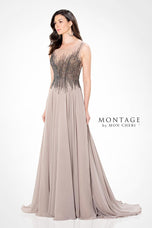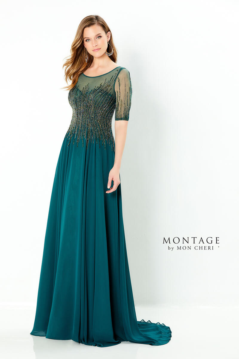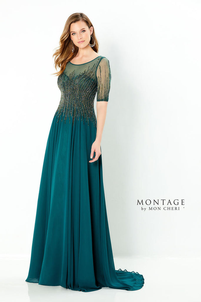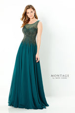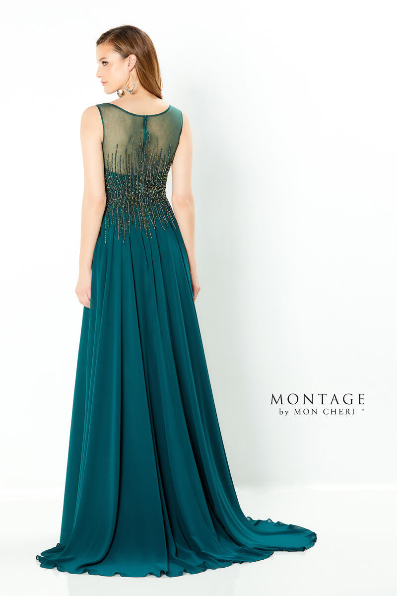 Pure elegance is this long formal gown from Mon Cheri by Montage,220939.Perfect wear to any social event or Mother of the Occasion! This gown is a sleeveless, chiffon, A-line gown. This gown has an illusion jewel neckline with a beaded bodice. Completing this look is the eye-catching illusion back and sweep train!