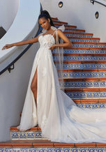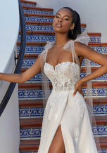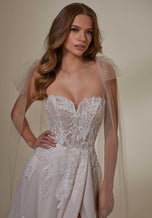 Feminine and floral, this is Maeve from the Fall 2023 Morilee Bridal gown collection. Designed with an effortless A-line silhouette in lightweight tulle over glitter tulle for a little extra sparkle, we're loving the idea of her shimmering under the chandelier at your formal reception or sparkling in the starlight at your outdoor affair! The sweetheart bodice is adorned in crystal beaded, floral lace appliqus that cascade down the wrap-style skirt with a front slit. The detachable tie straps add to the whimsical fantasy of the dress. Consider lining the bodice and/or closing the slit for a more modest bridal gown feel.