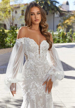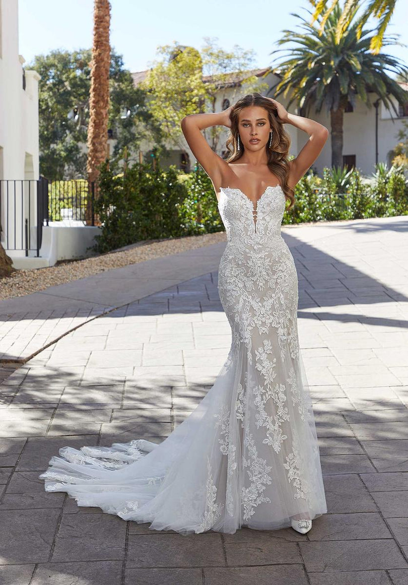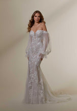 The Marion designer wedding dress is sexy and romantic with a curve-hugging fit and flare silhouette designed with decadent frosted, embroidered lace. Designed for the Fall 2023 Morilee Bridal Gown collection, the strapless, sweetheart neckline features a seductive plunge and glitter tulle gives the gown an unreal sparkle. The illusion back reveals the intricate boning and leads to the dreamy sheer train. Pair the dress with detachable bishop sleeves for a touch of whimsy for your winter wedding or outdoor ceremony. Sleeves also sold separately as Style 11475.