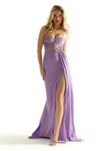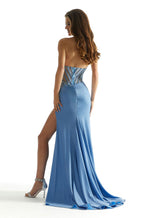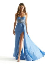 This Morilee Prom dress is not one to be missed! 49003, showcases a strapless sweetheart neckline on a corset bodice with sheer midriff and elegant pearl and crystal beading with glitter, adding a touch of spark to your look! A glitter skirt with an exposed sexy leg slit complete this fabulous gown. Be on trend with this gown from Spring 2024 Collection.