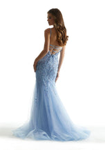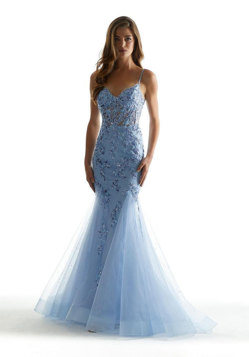 Look and feel like a million bucks in this stunning gown, 49043. This Morilee masterpiece showcases a modest v-neckline with spaghetti straps that lead to an eye-catching open lace-up back for a snug fit. The mermaid silhouette is garnished with shimmering sequins that trickle down to the tulle skirt. Make this your go-to gown for any speical occasion.