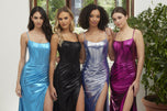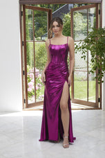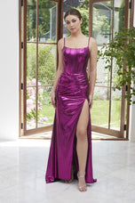 Metallic prom dress has a corset bodice and lace-up back on a draped skirt in foiled jersey.We love a metallic look for prom 2025! 49105, features a scoop neckline on corset top, thin straps that lead to an eye-catching open lace-up back. The side pleating that connects to the sexy side leg slit. This is perfect for a night out to prom!