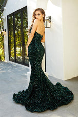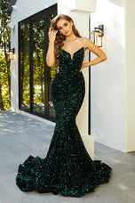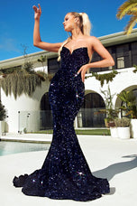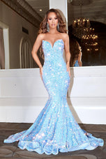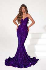 One of our favorite Insta-worthy prom dresses is PS21208 by Portia and Scarlett! This fitted velvet sequined prom dress will have heads turning while it hugs your every curve! From the unique peaked fitted bodice to the curve hugging silhouette and horsehair hem, this strapless gown has all the details! Go classic in Red or Bold in Hot Pink!